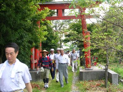 刀尾神社の赤鳥居をくぐる参加者と見送り隊 |